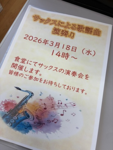 当施設にてサックスコンサートを開催いたします。