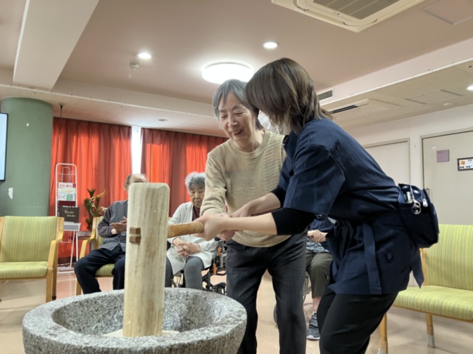 スタッフと一緒に杵を持ち上げるTさんに