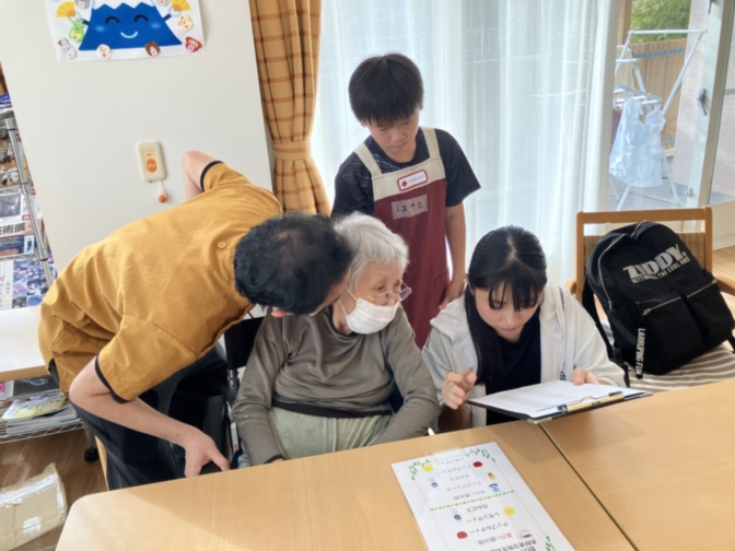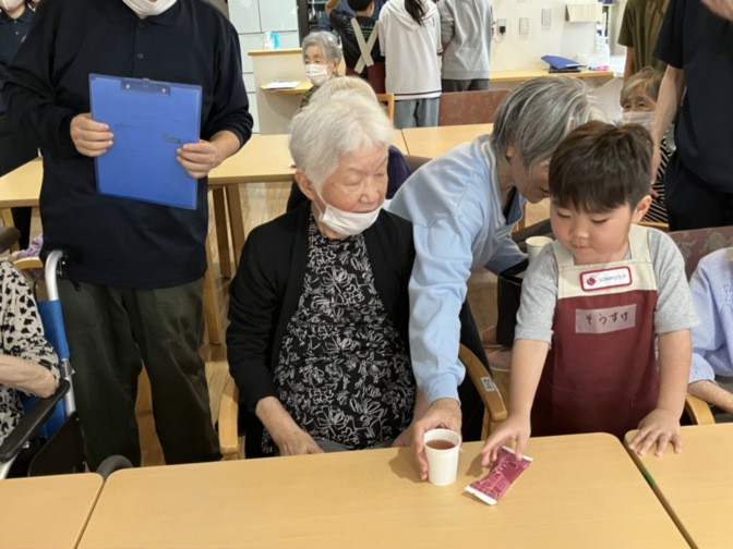 いざおやつの時間になると、子どもたちはニコニコと優しい表情でおやつを配り、受け取った利用者の皆さんも「ありがとう」と笑顔で応えていました。