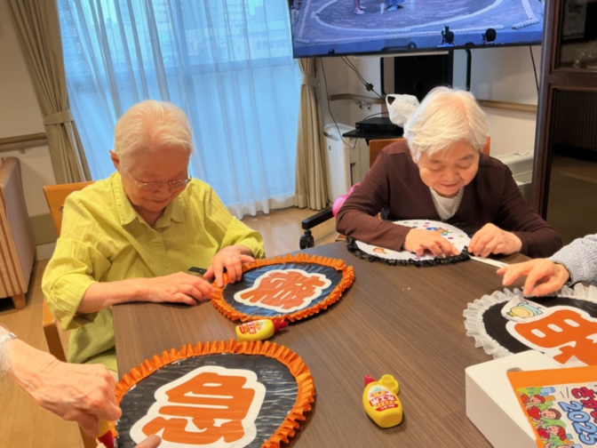 今回はタスキを受け取る際にホームでお出迎えするために、うちわや旗をご入居者様と一緒に作成しました。