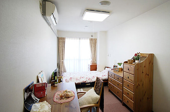 全室個室なのでご面会は24時間いつでもお気軽にお越しいただけます。居室にトイレや洗面台もあり、ご自宅と同様のプライベート空間を確保。また、緊急通報装置が各所に設置されており安心です。