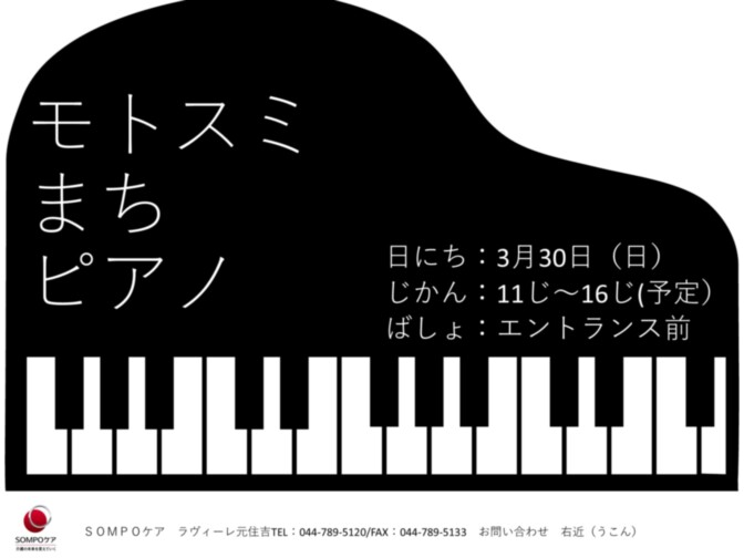 ホームのグランドピアノを地域の皆さまに開放して自由に弾いて頂くストリートピアノ【モトスミまちピアノ】を開催します。