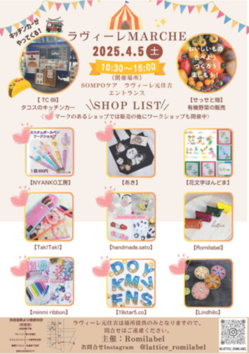 ラヴィーレ元住吉でマルシェを開催いたします。当日はハンドメイドの作品やオーガニック野菜の販売、ワークショップ、更にはキッチンカーもやって来ます。