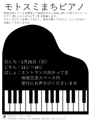 地域交流スペースを開放してホームのグランドピアノを自由に弾いて頂くストリートピアノ【モトスミまちピアノ】を開催いたします。