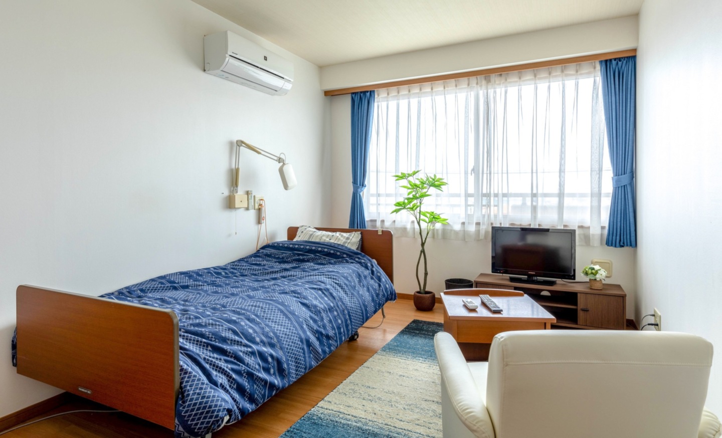 全室個室なのでご面会は24時間いつでもお気軽にお越しいただけます。居室にトイレや洗面台もあり、ご自宅と同様のプライベート空間を確保。また、緊急通報装置が各所に設置されており安心です。