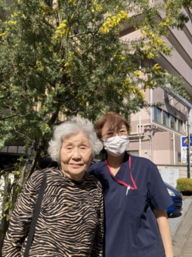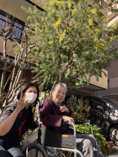 今日は少し風の強い一日でしたが、ご入居者様と一緒にテラスへ出て、咲き始めたミモザを眺めました。