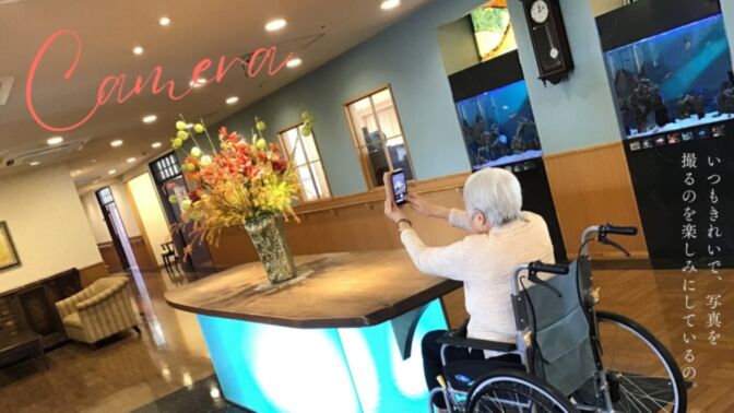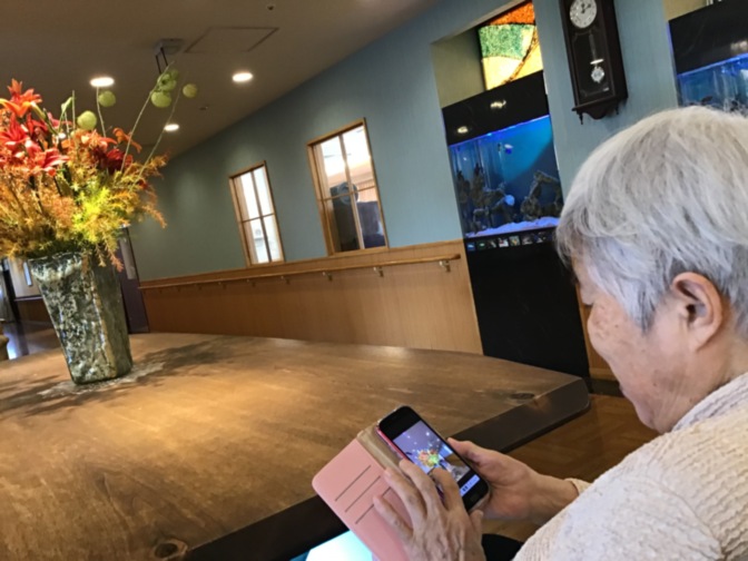 「いつもきれいなお花で、毎週写真を撮るのを楽しみにしているの」と携帯で撮られたお写真を見て笑顔のご入居者さま。