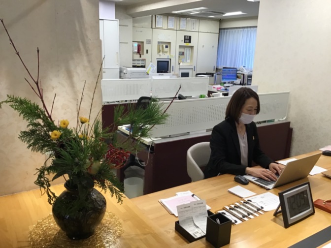 エントランスには門松が立ち、エントランス、受付にはお正月らしい花が彩りを添え、