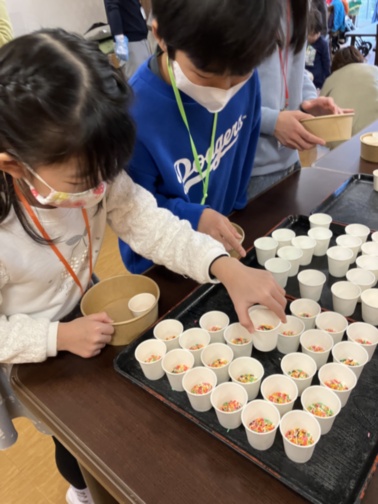小分けにしたフルーツをコップに並べさせていただき皆様に選んでいただきました☆