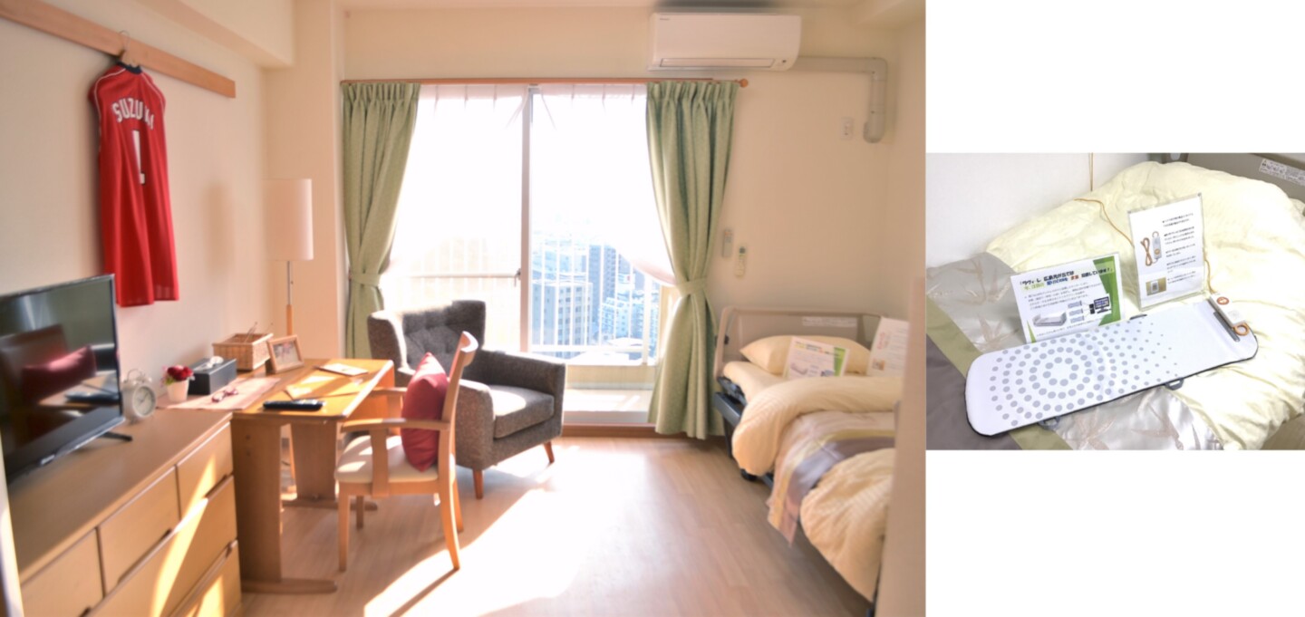介護ベッドの下には【睡眠センサー】を設置しており、ご入居者さまの「眠りの状態」をスキャンし、睡眠障害の改善、眠りのリズムを整えて健康促進につなげています。