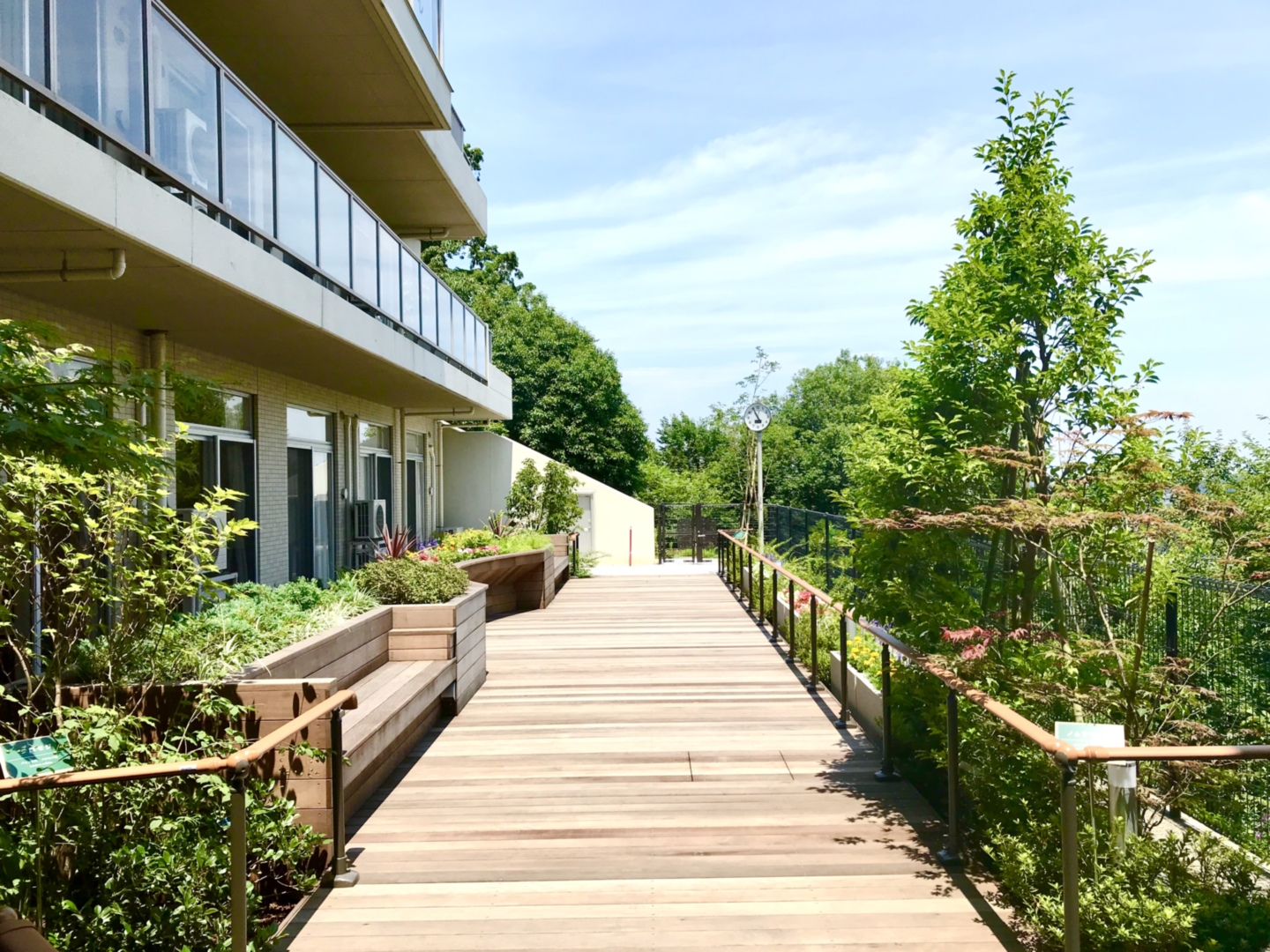 2021年4月に「認知症のある方にもやさしいデザイン」をコンセプトに新設された天然の木材を使用したウッドデッキ。移り変わる季節の花々を楽しみながら、アクティビティや機能訓練を行います。