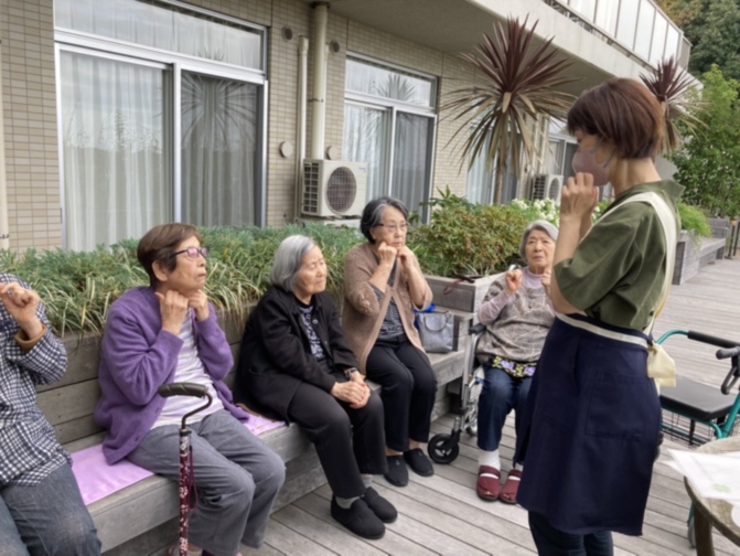 少し肌寒い陽気でしたが、ウッドデッキにて、