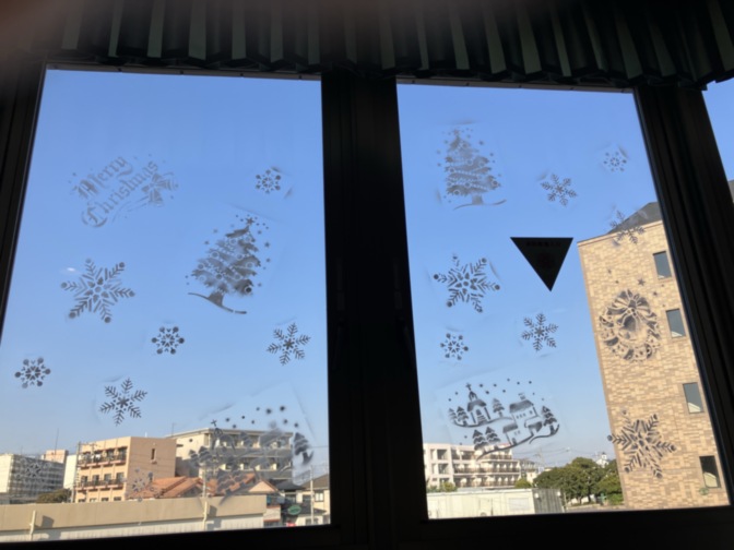 玄関前にツリーを飾りました。4階の窓はスノースプレーで飾っています。
