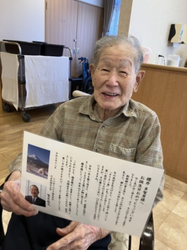 スタッフからのハッピーバースデーと社長からのメッセージをお渡しすると、