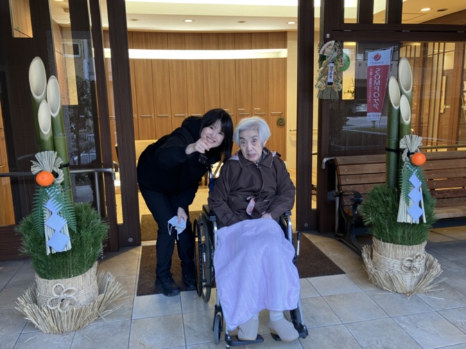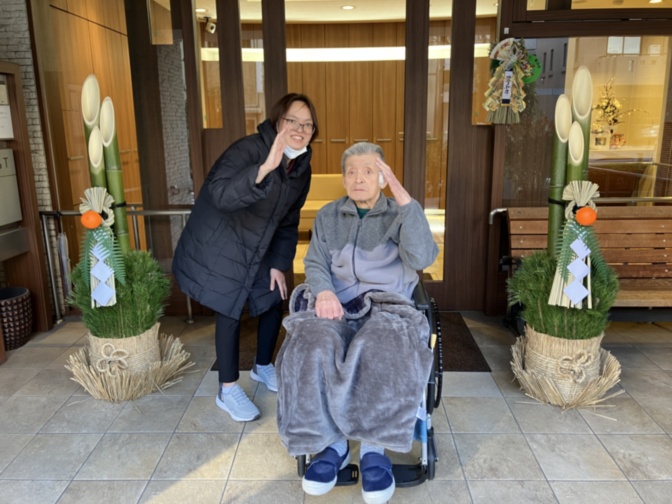 一部のご利用者様にはなりますが、下の写真はお散歩の後にホームの前で撮った写真です。
