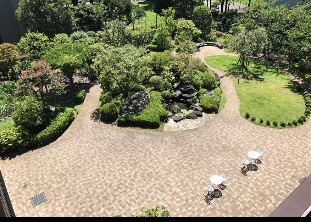 中庭の中心に滝が流れ、水の涼しげな音が心を癒してくれます。