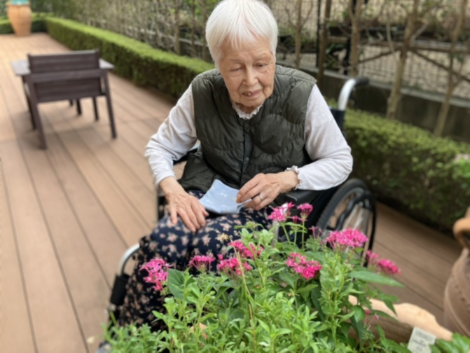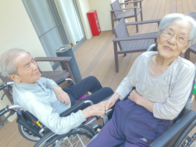 最近ではやっと過ごしやすい気候になってきたので、ホームのベランダにて日光浴をして頂いています。外に出ると皆さま気も落ち良さそうな笑顔で過ごされています。