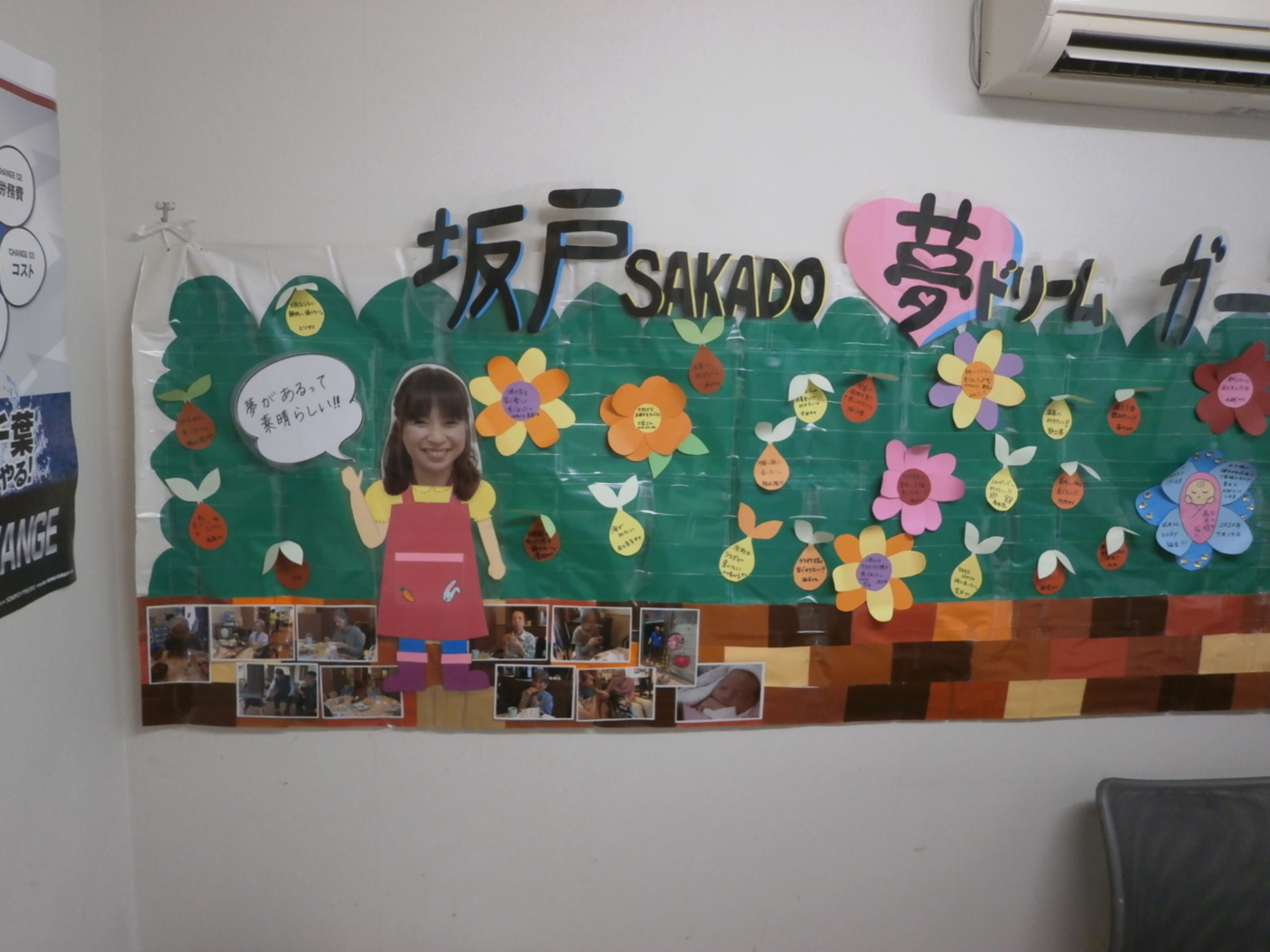 スタッフがご入居者さまの今したいことを定期的に聞き取り、スタッフ間で共有ができるように、スタッフ休憩室に夢の花壇(聞き取った夢を掲示)を作成し、毎月1~2名の方の夢の実現のお手伝いをしております。