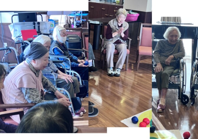 今日のレクレーションは、的をめがけてボールを投げる「ボッチャ」です!
