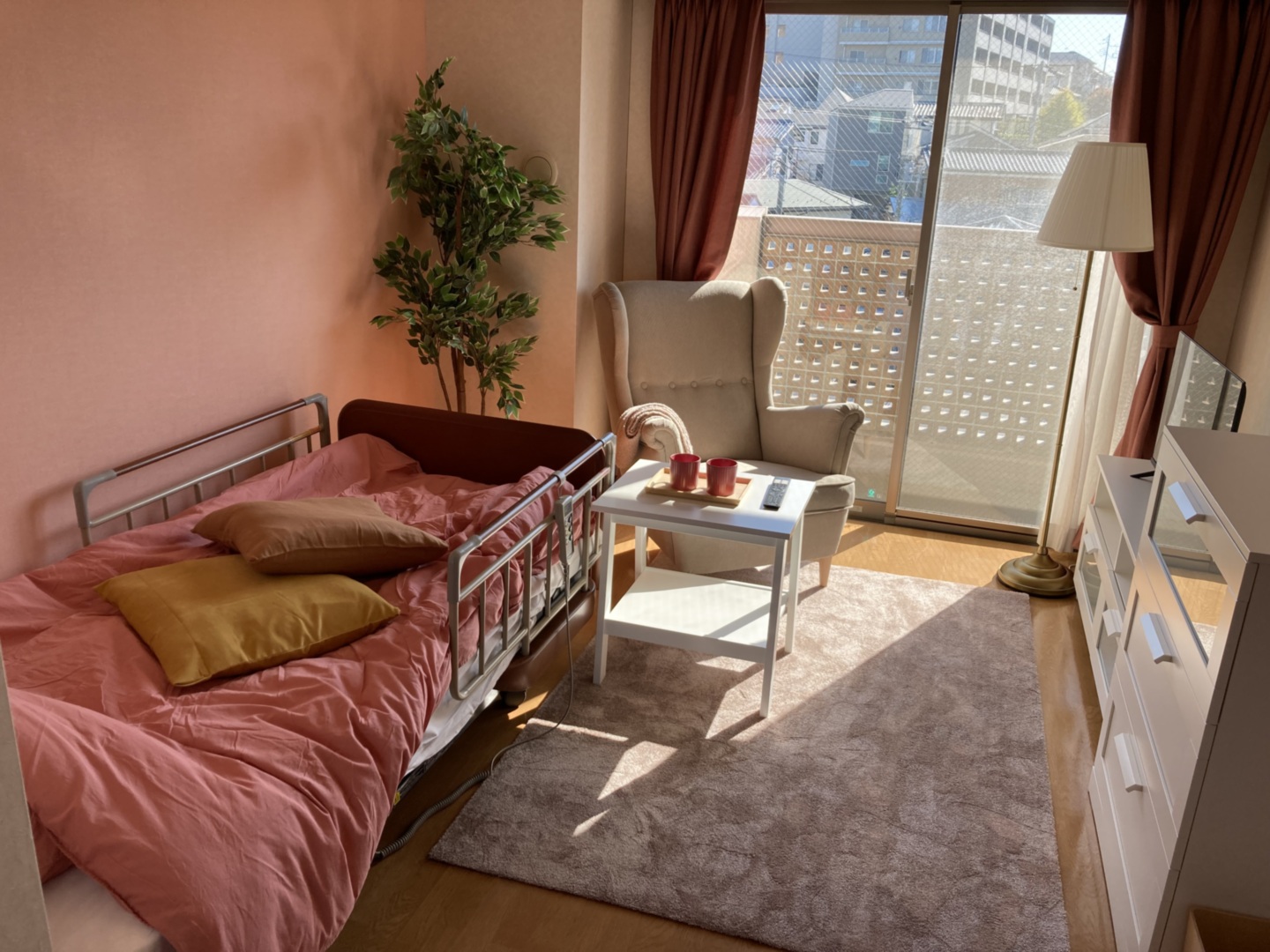 全室個室なのでご面会は24時間いつでもお気軽にお越しいただけます。居室にトイレや洗面台もあり、ご自宅と同様のプライベート空間を確保。また、緊急通報装置が各所に設置されており安心です。