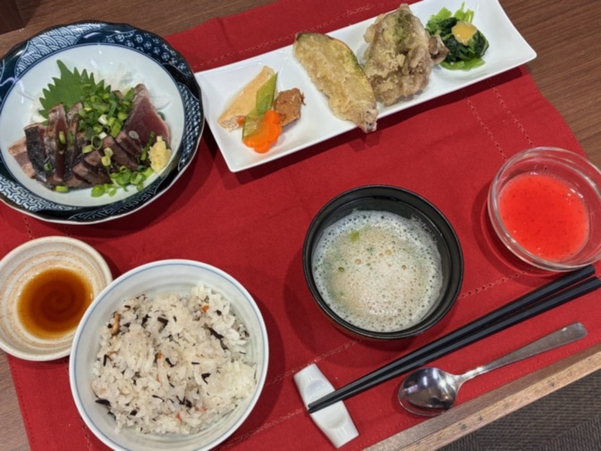 メニューは ・かつおの藁焼き ・豆ひじきご飯 ・さつまいも、舞茸の天ぷら ・五目豆腐いなり ・長芋すりながし汁 ・小松菜のからし酢味噌 ・苺甘酒ゼリーです。