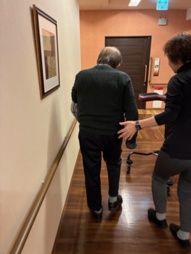 歩行器を使わずに館内を一周するラウンド歩行や、背伸びの運動、ボールを使った体幹トレーニングなど、無理のない範囲で一つひとつ丁寧に。