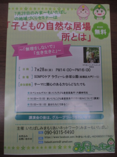 7月28日(日)の午後にみま~もいたばし様による「子どもの自然な居場所とは」という地域づくりセミナーが行われます。入場無料ですので、ご興味がございましたら、いたばしみまもりあいネットワーク(TEL:090-9315-6490)にご連絡の程お願い致します。