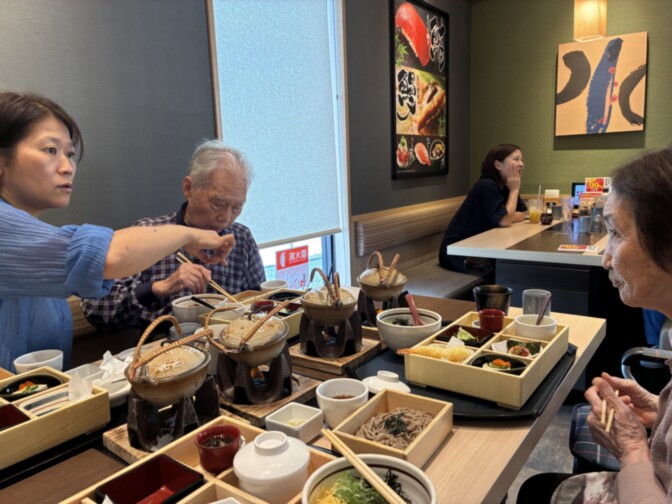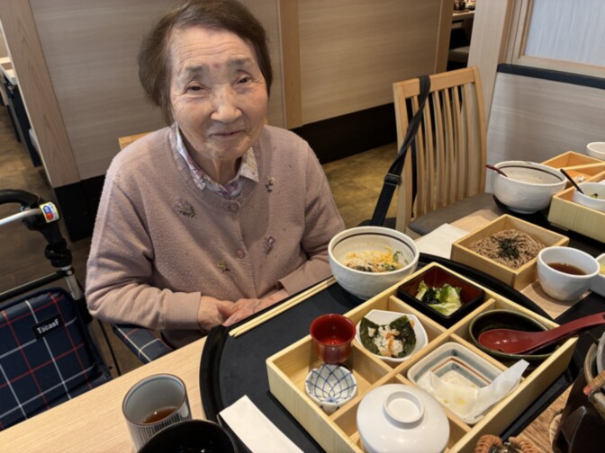今日はプライベートサービスを利用して、ご入居者様をお食事にご案内いたしました。選んだメニューは季節の食材が盛り付けられた松花堂弁当。いつもと違った環境のなかで、自然と会話が弾み、懐かしい思い出やご家族のお話に花が咲きました。