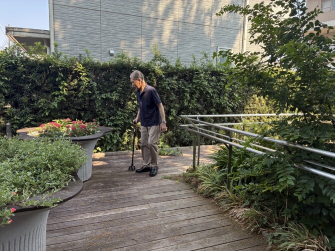 「屋内だけでなく外も歩かないと、歩けなくなっちゃうよね~」と言いながらひとりで歩行練習をしているご入居者様。