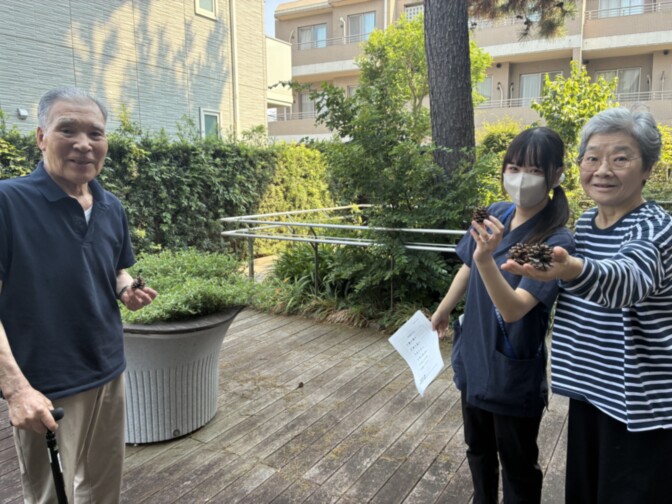 ウッドデッキに落ちている『松ぼっくり』を手におしゃべりをしています(^^♪