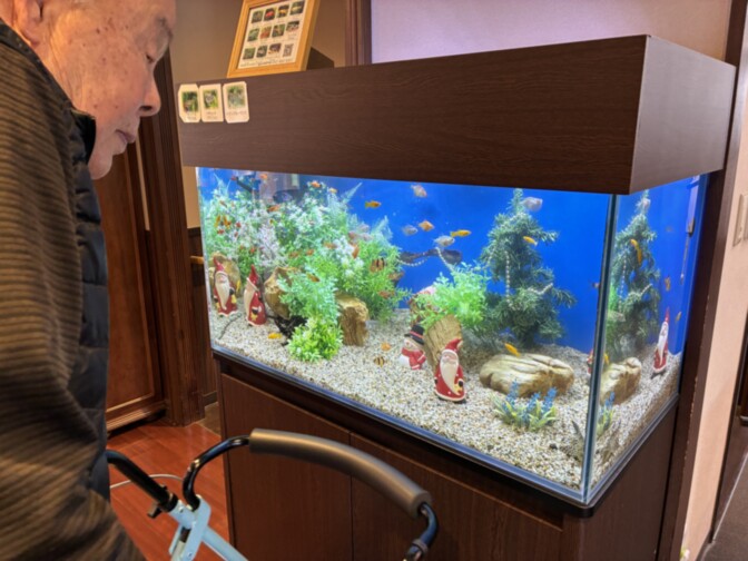 水槽の装いが、一足早くクリスマスに変わりました。気がつけば今年も残りわずか。一年が経つのは本当にあっという間ですねー。水槽を眺めながら、そんな季節の移ろいを感じていただければと思っています。