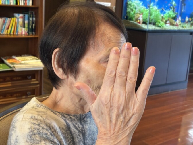 少し照れながら「老人の爪を、こんなにきれいにしてくれるの?」とお話しされているご入居者様。