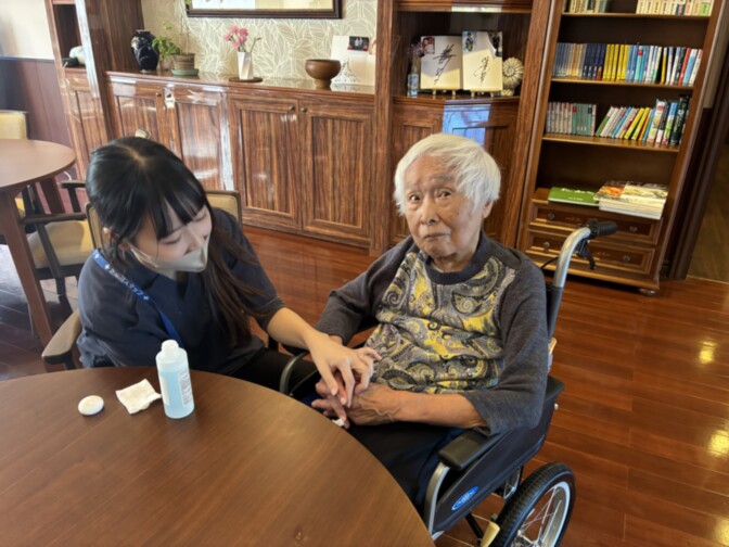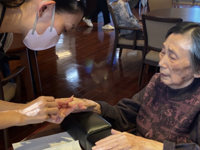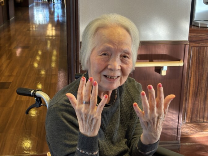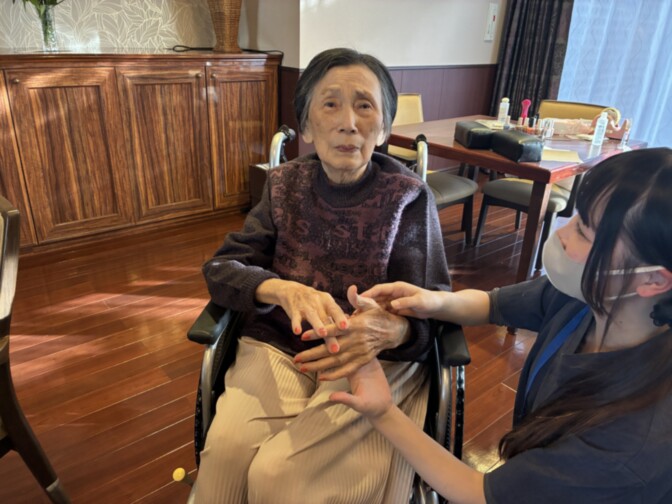 毎月楽しみに参加されているご入居者様のネイルアート。ネイリストからは「この方の爪は本当にきれいで、とても塗りやすいんです」と言われています。