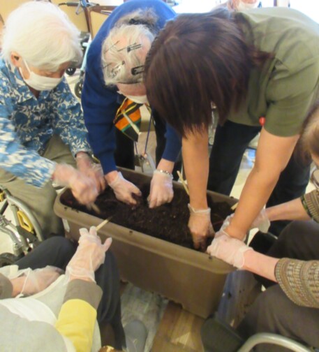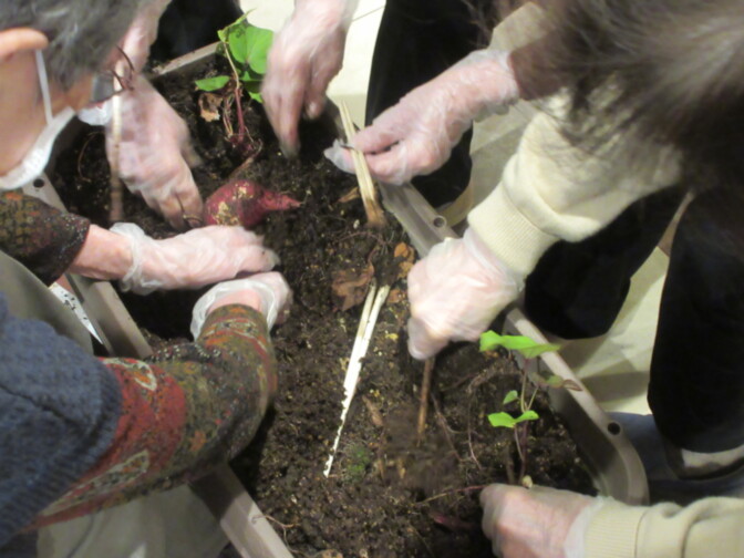 仲の良いご入居者様同士「もっと下じゃない?」「傷つくからやさしく掘らないと…」など声が飛び交います。