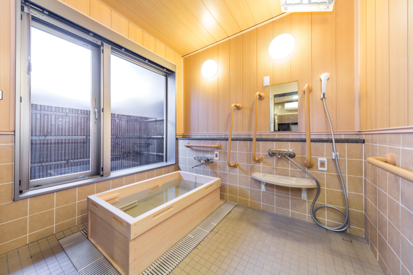 ヒノキが香る檜風呂、温泉気分で入浴できます。他に一般浴、特殊浴とあり皆さま個浴でゆっくり入浴を楽しめます。