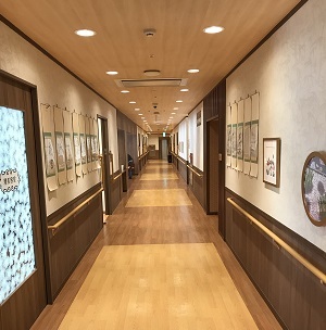 共用部の床は3m間隔に色が変わっており、歩行リハビリの目安になるので、生活リハビリとしても活用されています。手すりの高さは高齢者の平均身長から算出された高さになっています。