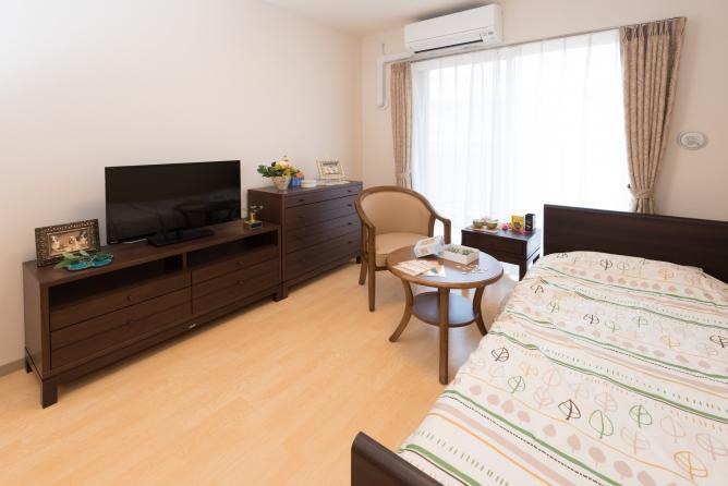 全室個室なのでご面会は24時間いつでもお気軽にお越しいただけます。居室にトイレや洗面台もあり、ご自宅と同様のプライベート空間を確保。また、緊急通報装置が各所に設置されており安心です。