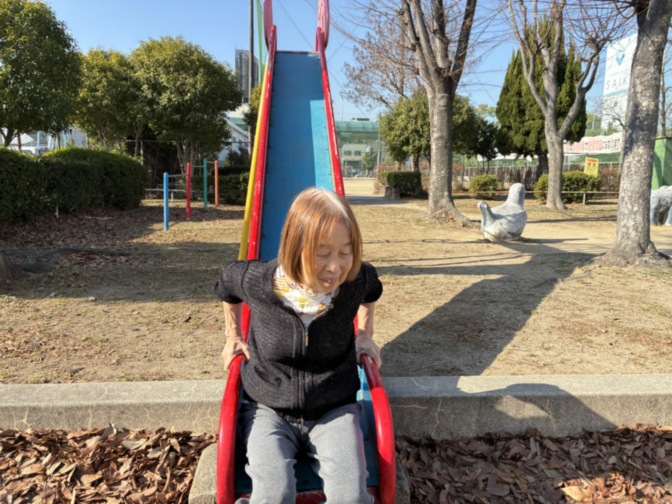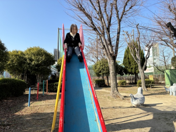 帰り道、「滑り台、久しぶりに滑ってみようかな」と話されたので、立ち寄りました。