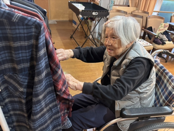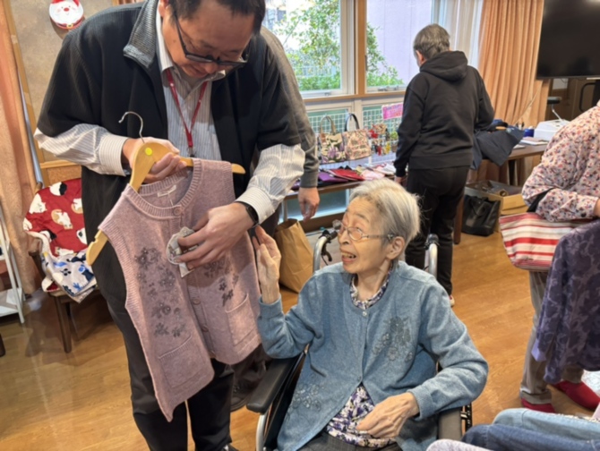 「この色はどうかしら」「やっぱりこの柄がいいわ」など、 商品を見比べながらご家族や職員と会話が弾み、自然と笑顔が広がります。