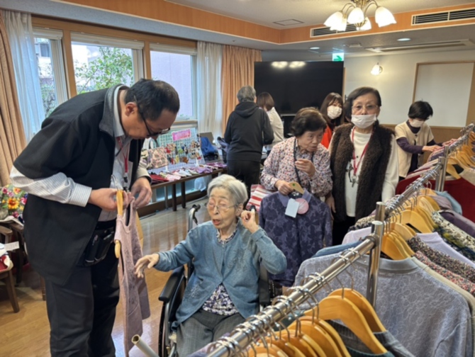 季節の変わり目に合わせて、ホームに移動百貨店が来てくださいました。 衣料品や小物など、さまざまな商品が並び、入居者様は直接手に取って買い物を楽しまれていました。
