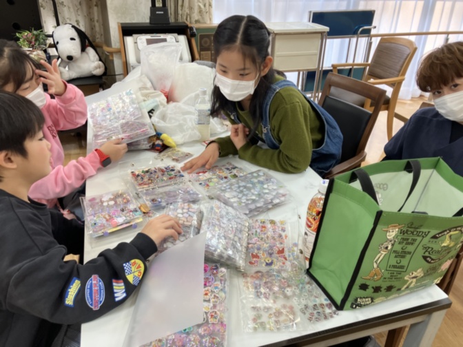 食事が終わってから、子ども達が今流行りのシール帳を持って来てくれていたので、見せてもらったり交換している様子をスタッフの古城さんと見ていました(*^-^*)