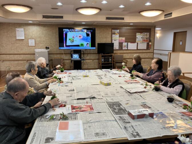 苔玉風の丸い土台に、節分をイメージした可愛らしい鬼のお面や、季節の花々を思い思いに飾りつけていただきました。