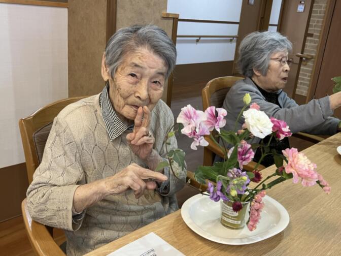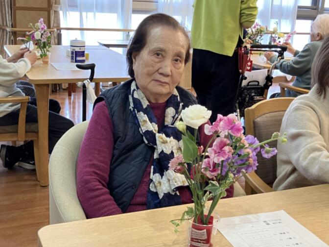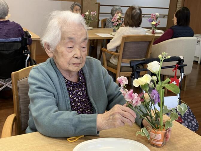 フラワービュッフェは、季節を感じながら手先を動かし、創作の楽しさを味わっていただける人気のレクリエーションです。次回も、皆さまに喜んでいただけるよう、季節の花をご用意して開催する予定です。
