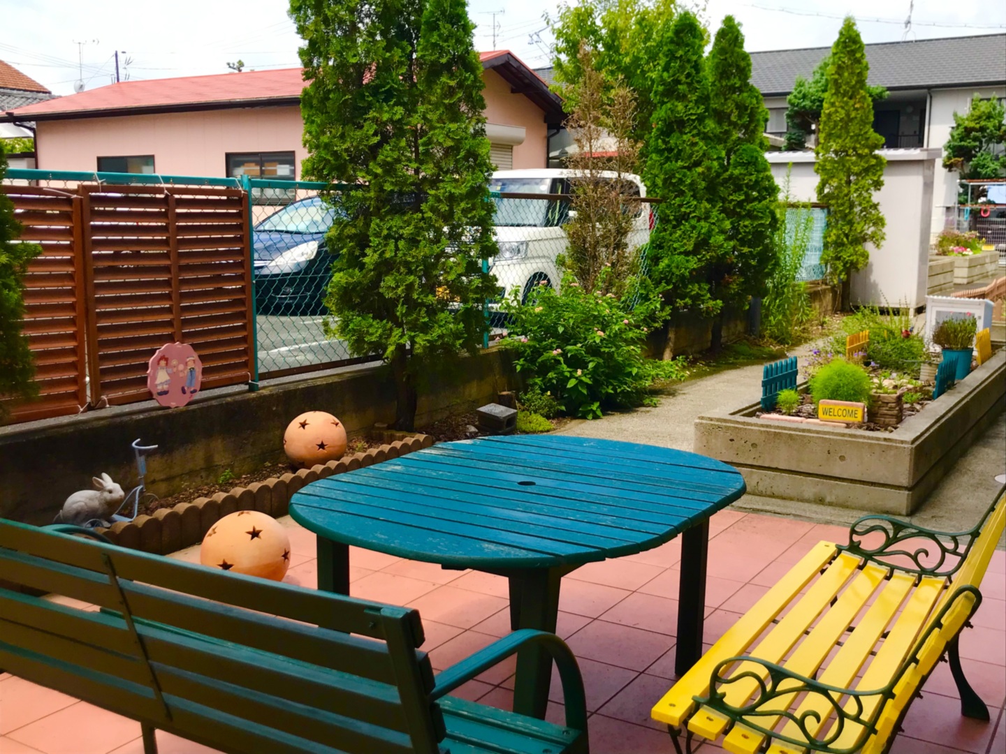 スタッフお手製のベンチやインテリアを揃えており、目で見て楽しめるを追及しています。お茶をしたり面会スペースとしてもご利用いただけます。