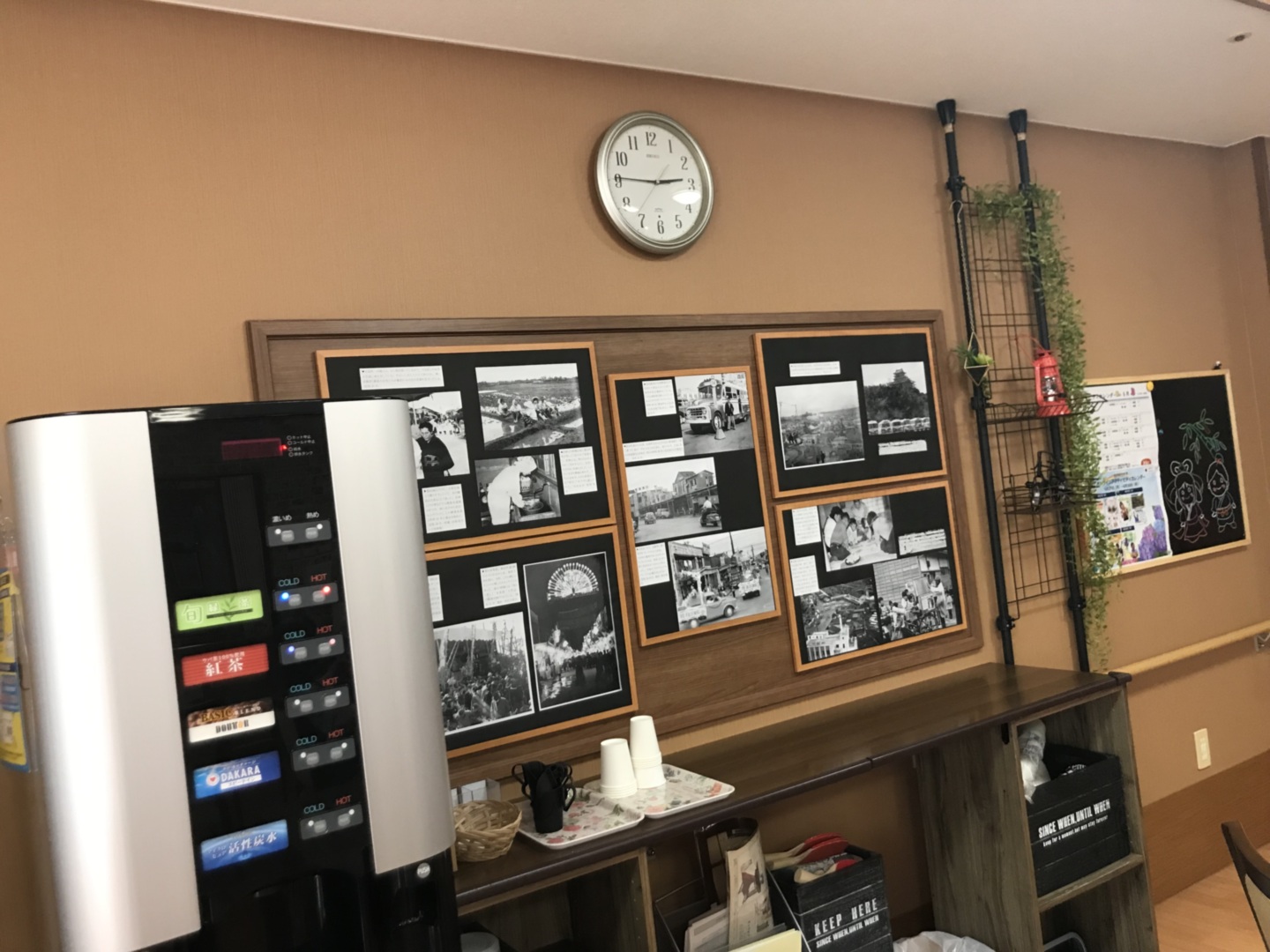 ドリンクバーの近くには目を引く掲示物があり、昔なつかしい空間には話題が広がり人が集まる場所となっています。