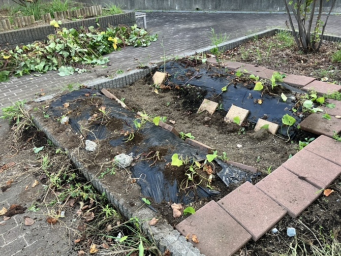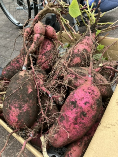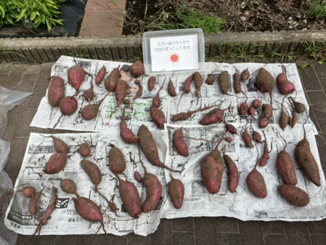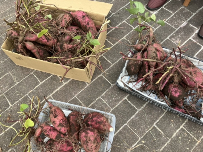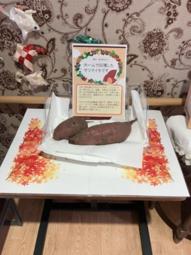 収穫したサツマイモの一部は1階共用スペースにて展示しています。サツマイモは収穫してすぐに食べても美味しくありません。寝かせると、デンプンが糖に変化して甘味が