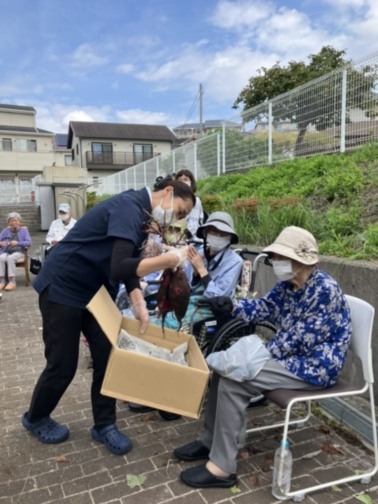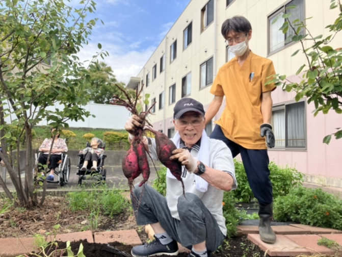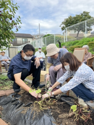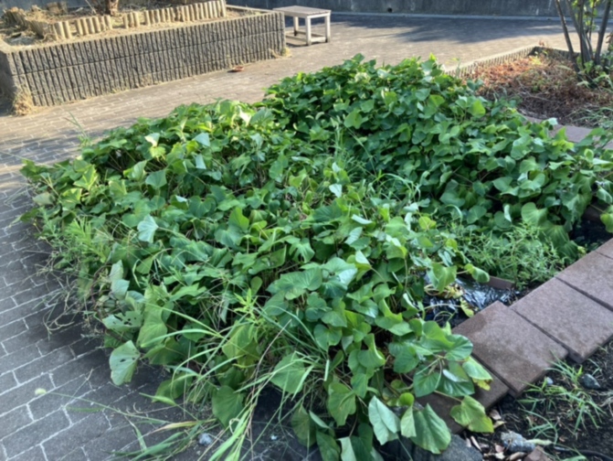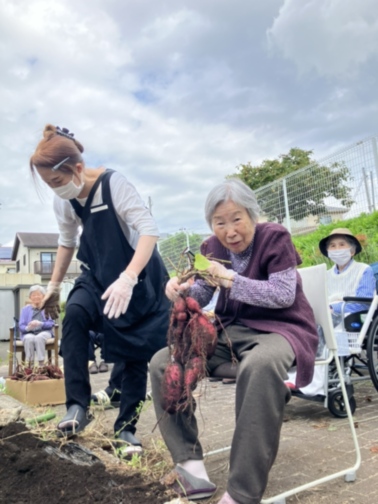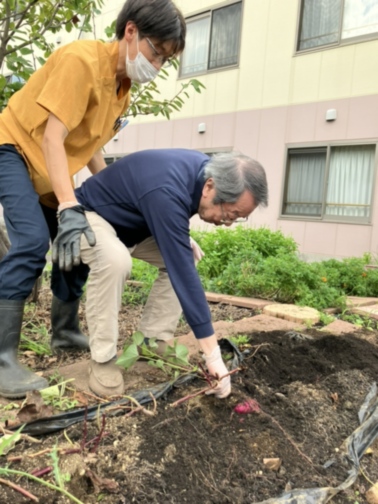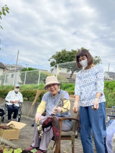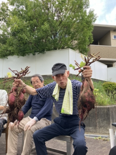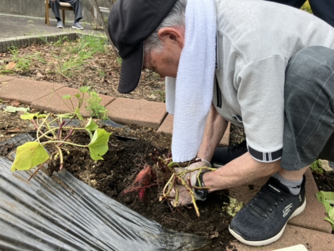 本日はホームの中庭に植えているサツマイモを収穫しました。