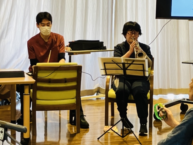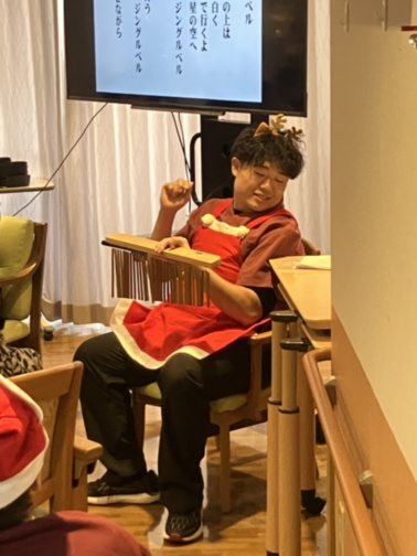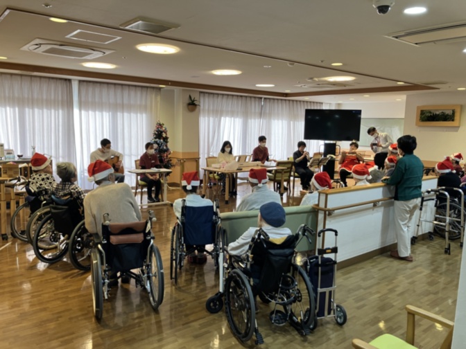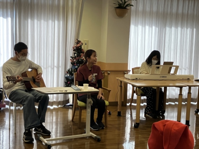 ミュージックセラピーの白井さんと5人の職員によるクリスマスソングなどを演奏しました。