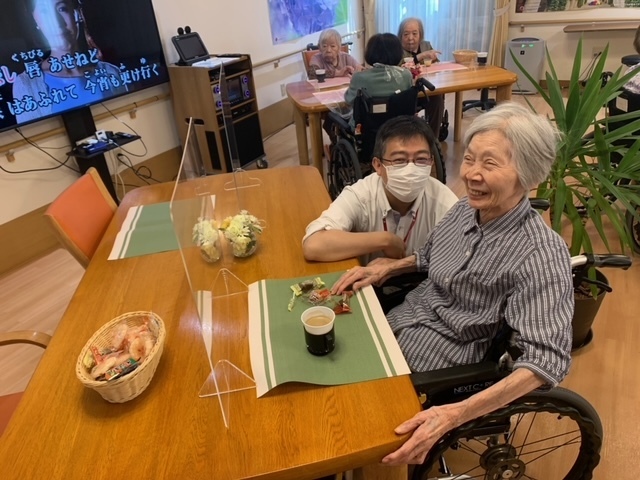 また、ご入居者さまの普段されていた生活に近づくように、訪問販売を月に2回実施しております。その他、図書館の設置、お散歩やお食事レクなど、様々な楽しみを皆さまのご希望を実現しております。