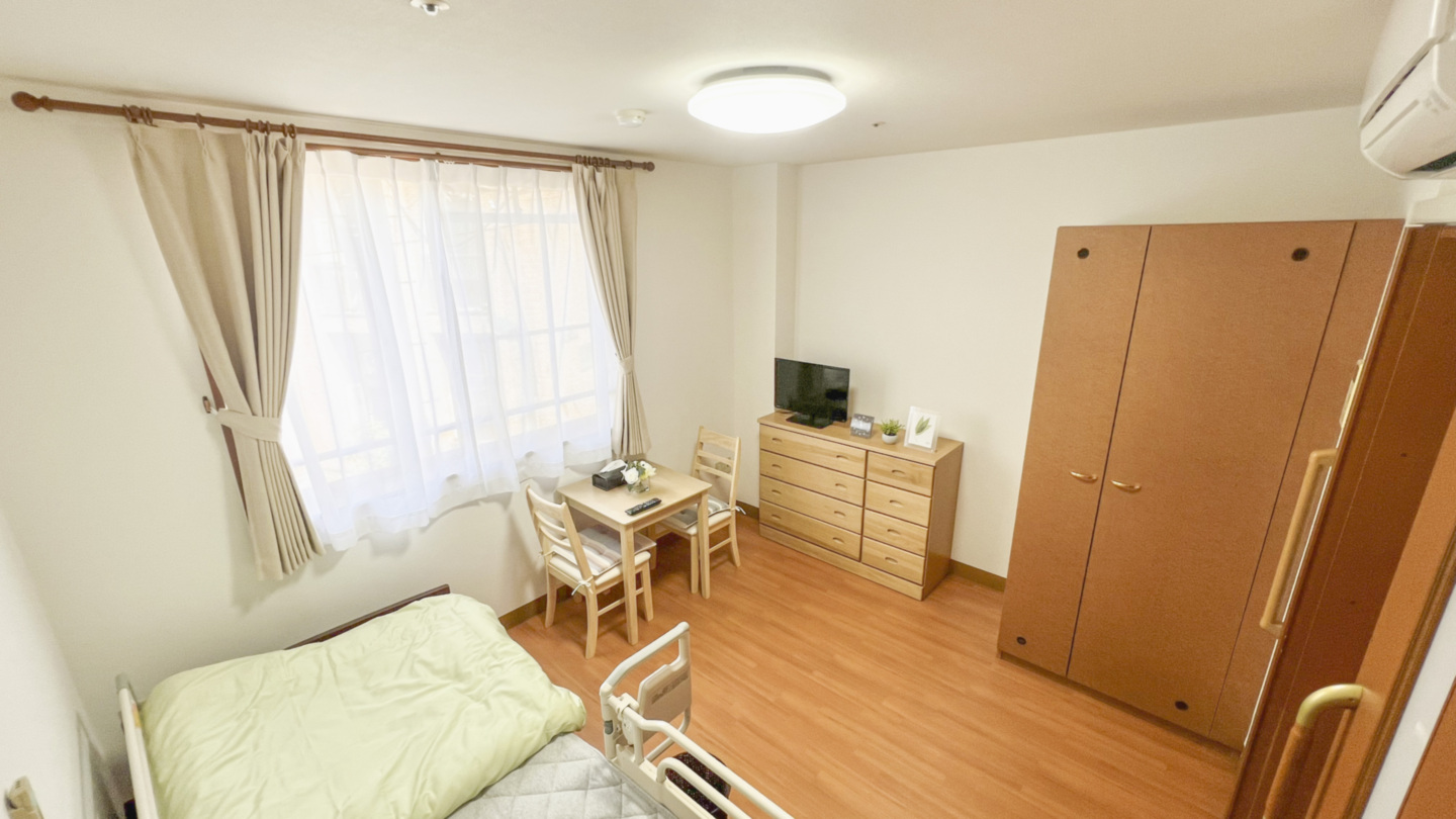 全室個室なのでご面会は24時間いつでもお気軽にお越しいただけます。居室にトイレや洗面台もあり、ご自宅と同様のプライベート空間を確保。また、緊急通報装置が各所に設置されており安心です。